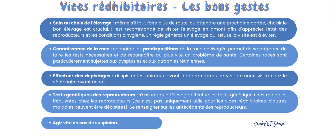 • Tests génétiques des reproducteurs : s'assurer que l'élevage effectue les tests génétiques des maladies fréquentes chez les reproducteurs (ce n'est pas uniquement utile pour les vices rédhibitoires, d'autres maladies peuvent être dépistées).