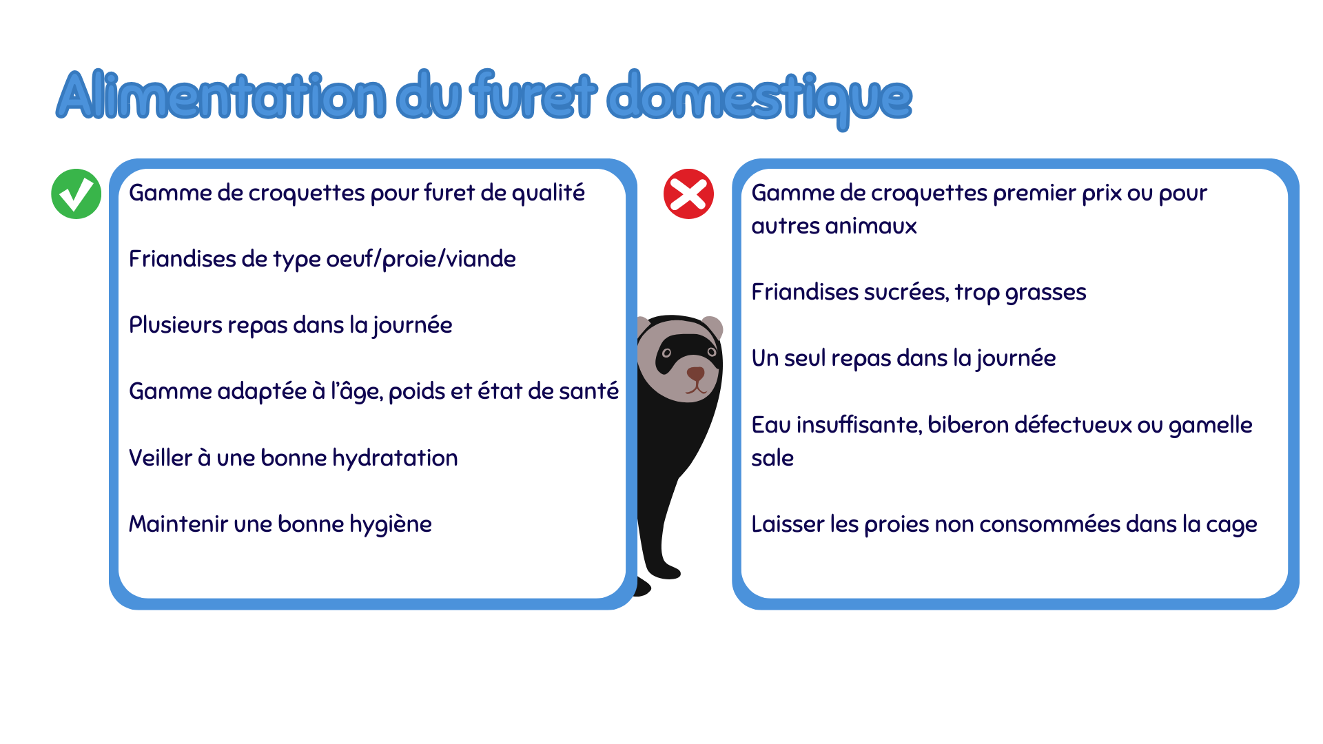 • Éviter les friandises industrielles non spécifiques aux furets.